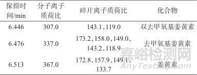 Tab. 4 Characteristic dye components and secondary fragment ions in turmeric