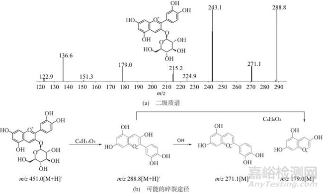 圖3 黃櫨提取液中特征化合物(m/z 451.0)的二級質(zhì)譜及其可能的碎裂途徑