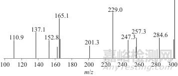 Fig. 5 Secondary mass spectrum of the characteristic compound (m/z 303.0) of the extract from the yellow-paper ancient books of the Qing Dynasty