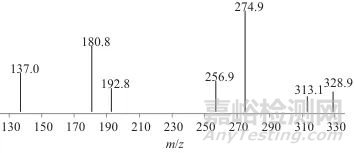 此外,清代黃色系古籍樣品提取液在3.435 min、4.573 min出現(xiàn)了m/z 303.0分子離子峰,其中4.573 min的色譜峰面積很小,并且由于含量過低導(dǎo)致二級碎片離子無法與槲皮素的特征離子相對應(yīng)。由于槲皮素不穩(wěn)定,容易在光照、溫度等影響因素下發(fā)生降解或某些化學(xué)反應(yīng),在古籍中隨著時間流逝易轉(zhuǎn)變?yōu)槠渌镔|(zhì),相關(guān)文獻[3]也報道了在古代紡織品中未直接檢測到槲皮素,對清代黃色系古籍m/z 303.0在3.435 min的分子離子峰進行分析,結(jié)果如圖5所示。由圖5可見,出現(xiàn)了m/z 229.0、152.8、284.6、257.3、165.1、137.1等碎片離子,二級質(zhì)譜結(jié)果與槐米中槲皮素的二級質(zhì)譜圖結(jié)果一致,因此推測該物質(zhì)為槲皮素發(fā)生了結(jié)構(gòu)變化后形成的同分異構(gòu)體,導(dǎo)致了保留時間的變化。此外,相關(guān)文獻[3]報道了一種槲皮素衍生物m/z 331,由槲皮素的—OH分子轉(zhuǎn)變?yōu)?mdash;COOH而得,實驗中清代黃色系古籍提取液得到了相似的結(jié)果,m/z 331.0在4.715 min的二級質(zhì)譜如圖6所示,主要碎片離子有m/z 313.1、274.9、256.9、192.8、180.8、137.0等,其余二級碎片離子與槲皮素的特征離子也均相同,因此,可以認定槲皮素存在于清代黃色系古籍的提取液中。此外,在清代黃色系古籍提取液中沒有找到梔子、黃檗、姜黃及黃櫨的特征染料分子離子及相對應(yīng)的二級質(zhì)譜碎片信息,空白實驗中沒有任一特征染料成分的分子離子質(zhì)譜信息。