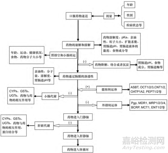 口服藥物被胃腸道吸收的過程非常復(fù)雜,首先藥物制劑在胃腸道內(nèi)崩解,然后溶解的藥物經(jīng)過胃排空和小腸轉(zhuǎn)移,經(jīng)腸膜跨膜吸收,最后經(jīng)肝靜脈進(jìn)入體循環(huán);在此過程藥物的吸收會受各種因素的影響,而食物影響藥物吸收的因素包括:食物中的成分與藥物發(fā)生化學(xué)反應(yīng)例如螯合反應(yīng),影響藥物的溶解;食物影響胃腸道生理條件如改變胃腸道的pH值,影響藥物溶解和滲透;食物也可能影響胃腸道的生理條件例如胃排空和小腸轉(zhuǎn)運(yùn)時間,影響藥物的轉(zhuǎn)運(yùn)等等[2]。口服藥物吸收過程及各階段的影響因素如下圖1所示: