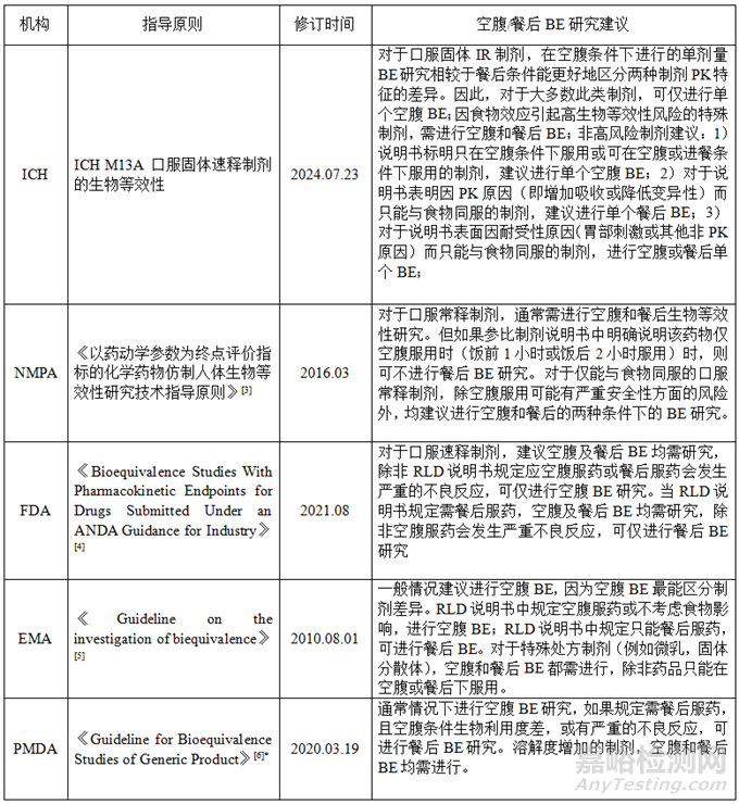 各國藥監(jiān)局對仿制藥BE研究空腹和餐后條件持有不同觀點(diǎn),一般情況下我國和美國要求空腹和餐后BE均需進(jìn)行,歐洲和日本要求僅空腹BE研究即可;NMPA、FDA、EMA及PMDA生物等效性指導(dǎo)原則與ICH M13A對比如下表所示: