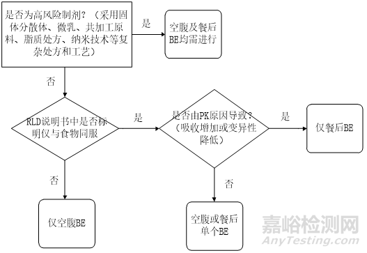 ICH M13A雖然推薦大多數(shù)口服固體速釋制劑可進(jìn)行單個空腹BE研究,但高風(fēng)險制劑和RLD說明書標(biāo)明只能同食物服用的品種仍需制藥行業(yè)研究人員評估確認(rèn)BE研究方案,可參考下述決策樹進(jìn)行評估;