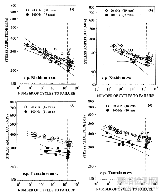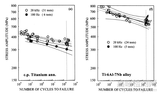 高頻疲勞試驗(yàn)機(jī)能夠模擬高頻載荷環(huán)境,對(duì)材料或構(gòu)件進(jìn)行快速、高效的疲勞測(cè)試,因此能夠顯著節(jié)約疲勞測(cè)試的成本。由于試驗(yàn)頻率高,可以在短時(shí)間內(nèi)完成大量的疲勞試驗(yàn)次數(shù),提高試驗(yàn)效率,特別是超高周疲勞測(cè)試,金屬材料的壽命在10七次方甚至至10的九次方的測(cè)試任務(wù)。這類試驗(yàn)機(jī)能夠模擬高頻載荷環(huán)境,對(duì)材料或構(gòu)件進(jìn)行疲勞測(cè)試。測(cè)試頻率對(duì)體心立方金屬和密排六方金屬疲勞壽命影響如下圖所示。