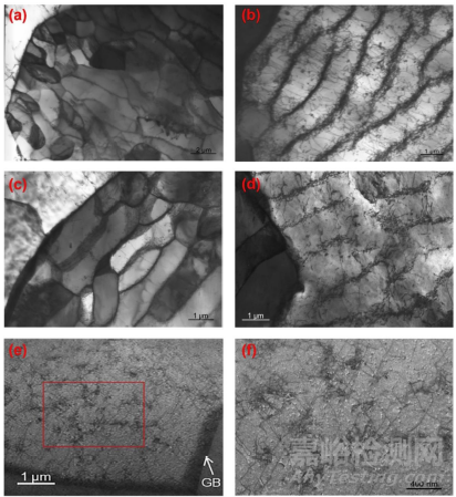 (a)0.2 Hz位錯(cuò)胞結(jié)構(gòu);(b)0.2 Hz梯形結(jié)構(gòu);(c)140 Hz位錯(cuò)胞結(jié)構(gòu);(d)140 Hz梯形結(jié)構(gòu);(e)20 kHz位錯(cuò)胞結(jié)構(gòu);(f)20kHz的梯形結(jié)構(gòu)。(Kamin Tahmasbi, 2023)