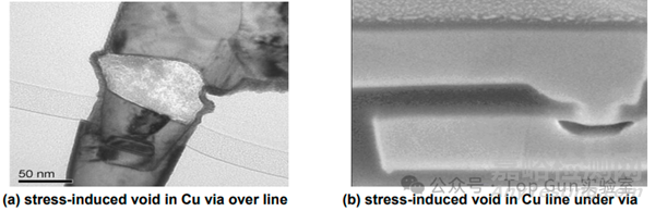 由于芯片制造中使用的不同材料和工藝溫度的組合,先進(jìn)銅互聯(lián)技術(shù)中的銅線路處于拉伸應(yīng)力狀態(tài)。當(dāng)幾何構(gòu)型在應(yīng)力中產(chǎn)生局部峰值,并且當(dāng)這樣的峰值存在于邊緣附著力差的位置或預(yù)先存在的工藝誘導(dǎo)空洞處時(shí),就會(huì)產(chǎn)生大的應(yīng)力梯度。應(yīng)力遷移(應(yīng)力誘導(dǎo)空洞,或簡稱為應(yīng)力空洞)這一術(shù)語指的是在這種機(jī)械應(yīng)力梯度的影響下金屬原子的移動(dòng)。