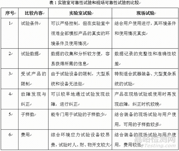 實(shí)驗(yàn)室可靠性試驗(yàn)和現(xiàn)場可靠性試驗(yàn)的比較見表1。