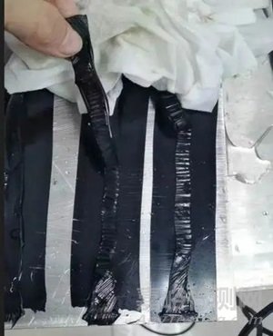 檢測結(jié)果為試樣4膠條僅有極少量黑色顯示,黏接質(zhì)量差;實(shí)物破壞過程中膠條很容易撕掉,破壞后質(zhì)量狀態(tài)與檢測結(jié)果一致,其視頻超聲檢測結(jié)果與實(shí)物對比如圖7所示。