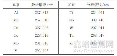 電感耦合等離子體原子發(fā)射光譜儀會產(chǎn)生豐富的離子和原子譜線,同時鎳基高溫合金成分復(fù)雜,其金屬元素通常含量較高,譜線干擾多。儀器譜線庫中有多條待測元素特征譜線供選擇,盡量選擇發(fā)射強(qiáng)度高、峰形好、干擾小、靈敏度高的譜線作為分析譜線。本試驗選擇的元素分析譜線如表2所示。