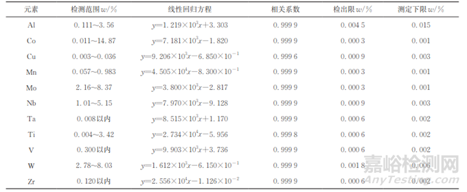 由表3可知:各元素的檢測范圍較寬,且線性相關(guān)系數(shù)均在0.9995以上,線性相關(guān)系數(shù)越高,表明所選擇的分析譜線干擾小,基體干擾低,檢測準(zhǔn)確度越高;各元素的檢出限均在0.0050%以下,大多數(shù)元素的檢出限低于0.0010%,除了Al元素外,其他元素的測定下限均不大于0.006%,表明該方法能夠?qū)Φ秃吭嚇尤〉幂^高的檢測能力。