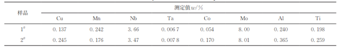 按照試驗方法對兩件牌號為GH3625鎳基合金樣品1#、2#進(jìn)行分析,各元素的測定結(jié)果見表5。