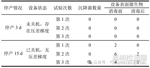 該試驗(yàn)是為了模擬企業(yè)短時(shí)間停產(chǎn) ( 停產(chǎn) 3 d,設(shè)備不關(guān)機(jī)、存在壓差梯度 ) 和長(zhǎng)時(shí)間停產(chǎn) ( 停產(chǎn)15 d,設(shè)備關(guān)機(jī)、無(wú)壓差梯度保護(hù) )2 種條件下的冷卻段沉降菌及設(shè)備表面微生物生長(zhǎng)情況,并進(jìn)行對(duì)比。長(zhǎng)時(shí)間停產(chǎn)后再次啟用設(shè)備,企業(yè)多采用人為熏蒸消毒或擦拭消毒,因此同時(shí)考察了人為消毒后設(shè)備能否達(dá)到無(wú)菌環(huán)境要求,是否存在消毒不充分的風(fēng)險(xiǎn)。設(shè)備未關(guān)機(jī)時(shí),隧道烘箱的滅菌溫度設(shè)定值為 315 ℃,履帶設(shè)定速度為 121 mm/min。
