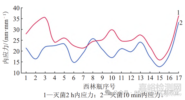 圖 1 滅菌不同時(shí)間、不同西林瓶的內(nèi)應(yīng)力對(duì)比 (n=17)