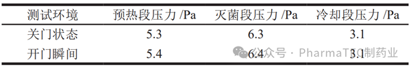 設(shè)備所在房間較小時(shí),洗瓶間的門在快速打開或關(guān)閉的瞬間,可能會(huì)造成洗瓶間壓力突然增大,破壞設(shè)備的壓差平衡,造成污染風(fēng)險(xiǎn)。因此,本項(xiàng)考察洗瓶間門快速打開的瞬間,預(yù)熱段、滅菌段和冷卻段對(duì)房間的壓差變化情況。