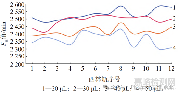 西林瓶清洗后進(jìn)入隧道式烘箱進(jìn)行滅菌,此時(shí)模擬吹氣針孔堵塞或瓶翻轉(zhuǎn)后玻璃罩凝結(jié)水回滴造成瓶中水分殘留,就可考察水分殘留對(duì)滅菌產(chǎn)生的影響。選擇4 個(gè)加水量梯度:20、30、40、50 μL,每個(gè)加水量做1 次驗(yàn)證,共 4 次。每只西林瓶做好標(biāo)記,分別加入水,并將溫度探頭放入西林瓶的底部,經(jīng)預(yù)熱段、滅菌段、冷卻段后,停止隧道網(wǎng)帶的運(yùn)行。記錄不同水分殘留量條件下干熱滅菌的殺菌熱力強(qiáng)度 [FH,參照基準(zhǔn)溫度 (T0=170 ℃ ) 下的標(biāo)準(zhǔn)干燥滅菌時(shí)間得到 ]。