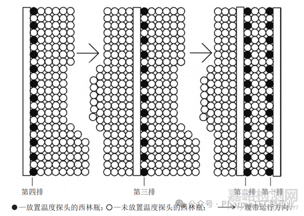 本試驗(yàn)布置 4 排,每排布 12 支探頭,隧道烘箱溫度驗(yàn)證布點(diǎn)圖如圖 3 所示。第一排為最前端,固定架探頭放在最前排瓶?jī)?nèi),開始按正常生產(chǎn)狀態(tài)洗瓶,洗瓶至距第一排探頭約 30 cm 處,停止洗瓶并暫停隧道網(wǎng)帶,布置第二排探頭固定架;網(wǎng)帶繼續(xù)運(yùn)行,待滅菌段布滿西林瓶后,布置第三排探頭;待第三排探頭通過(guò)滅菌段后,停止洗瓶,布置第四排探頭,操作方法與日常隧道式烘箱性能再確認(rèn)的方法一致。
