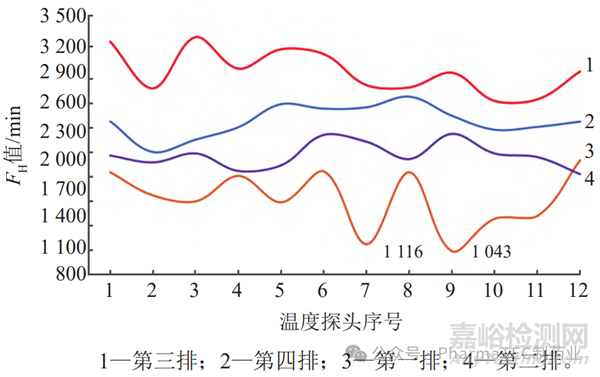 排布 4 排探頭的驗(yàn)證結(jié)果顯示,不同位置的 FH值存在差異。如圖 4 所示,其中第三排的 FH 值最高,第一排最低,依序?yàn)椋篎H( 第一排 )<FH( 第二排 )<FH( 第四排 )<FH( 第三排 )。第一排存在 FH<1 365 min 的情況,未達(dá)到相關(guān)標(biāo)準(zhǔn)的要求。