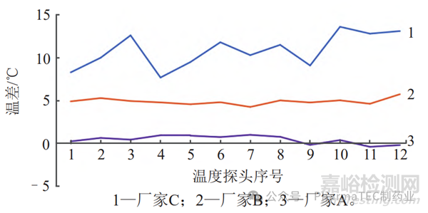 結(jié)果 ( 圖 5) 顯示,3 個(gè)設(shè)備廠家 (A ~ C) 的隧道式烘箱自帶探頭與西林瓶攜帶探頭測(cè)得的溫度存在差異,溫差平均值分別為 0.48、4.92、10.86 ℃。