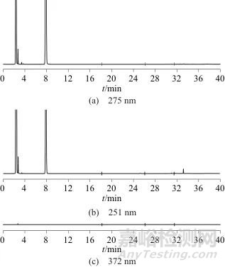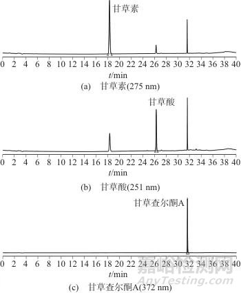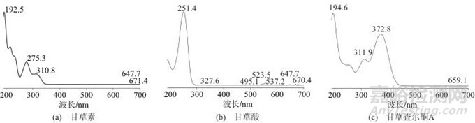 使用二極管陣列檢測(cè)器,在190~700 nm范圍內(nèi)進(jìn)行光譜掃描,甘草素、甘草酸、甘草查爾酮A分別在275、251、372 nm波長處有最大吸收,基于所檢測(cè)物質(zhì)為中藥提取物,且3種成分最大吸收波長各異,為了達(dá)到更好的檢測(cè)靈敏度,所以選擇各自最大吸收波長為檢測(cè)波長。各成分紫外吸收光譜分別見圖2。
