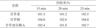 3種甘草類功效成分均易溶于極性溶劑,選擇水劑、乳液、膏霜3種劑型樣品,分別考察了常用于化妝品且毒性較低的75%乙醇溶液、75%甲醇溶液作為提取溶劑,結(jié)果表明,兩種溶劑都能均勻分散3種劑型樣品。由于75%乙醇溶液提取完成后,部分膏霜樣品因乳化嚴(yán)重導(dǎo)致過濾困難,75%甲醇溶液則可避免這個(gè)問題,所以選擇75%甲醇溶液作為提取溶劑。確定了提取溶劑后,在空白樣品中加入混合標(biāo)準(zhǔn)溶液,分別考察15、20、25 min超聲提取時(shí)間,結(jié)果顯示,15、20、25 min各成分的回收率無明顯區(qū)別,所以超聲提取時(shí)間選擇15 min,結(jié)果見表2。