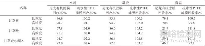 甘草類功效成分的檢測(cè)中濾膜的影響罕見文獻(xiàn)討論,建立方法的過程中使用常規(guī)尼龍有機(jī)濾膜和疏水性PTFE濾膜過濾回收率樣品,回收率結(jié)果見表3。由表3可見,甘草酸、甘草查爾酮A可能被濾膜吸附,導(dǎo)致回收率偏低,膏霜樣品中3種成分的回收率均受影響且吸附情況更嚴(yán)重;PTFE濾膜具有更強(qiáng)的化學(xué)兼容性,選用疏水性PTFE濾膜過濾,則得到滿意的回收率結(jié)果。