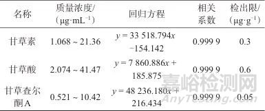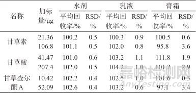 按1.4條件,采用外標(biāo)定量分析法,測(cè)定了系列混合標(biāo)準(zhǔn)工作溶液。分別以質(zhì)量濃度為橫坐標(biāo),色譜峰面積為縱坐標(biāo)繪制標(biāo)準(zhǔn)曲線,并進(jìn)行線性回歸分析。結(jié)果表明,甘草素、甘草酸、甘草查爾酮A在質(zhì)量濃度范圍內(nèi)與對(duì)應(yīng)的色譜峰面積均具有良好的線性關(guān)系,相關(guān)系數(shù)均為0.999 9。根據(jù)《化妝品安全技術(shù)規(guī)范》(2015年版)衛(wèi)生化學(xué)檢測(cè)方法總則要求,檢出限以3倍空白噪聲時(shí)對(duì)應(yīng)的質(zhì)量濃度表示[15]。實(shí)驗(yàn)結(jié)果見表4。