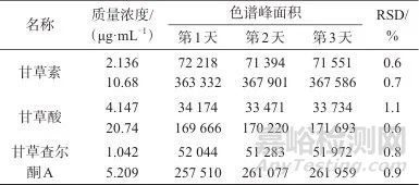 考察了高、低兩個(gè)濃度水平的空白基質(zhì)樣品加標(biāo)溶液的穩(wěn)定性,于4 ℃冰箱中放置3 d,比較甘草素、甘草酸、甘草查爾酮A色譜峰面積并計(jì)算相對(duì)偏差,結(jié)果見表6。由表6可見,3種成分在3 d內(nèi)穩(wěn)定,穩(wěn)定性相對(duì)偏差小于1.1%。