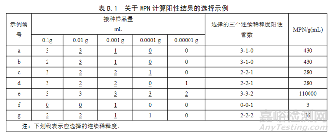 b)沒有任何一個稀釋度3管均為陽性。如果沒有一個稀釋度的3管均為陽性,則選擇三個最低稀釋度(見表B.1示例f)﹔如果在更高的沒有被選擇的稀釋度還有陽性結(jié)果,將此陽性結(jié)果加到選擇的最高稀釋度,進而確定三個連續(xù)稀釋度(見表B.1示例g)。MPN計算陽性結(jié)果的選擇示例見表B.1。
