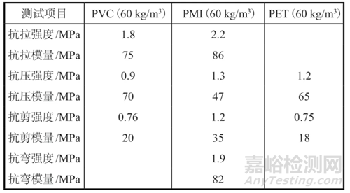 表1 幾種夾芯泡沫力學(xué)性能的比較。
