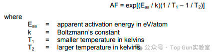 使用上面的公式,溫度T1相對(duì)于溫度T2的加速因子 AF 如下: