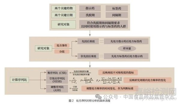 基于上一步產(chǎn)生的潛在藥品不良反應(yīng)信號,選取治療該藥品不良反應(yīng)的藥物作為標(biāo)簽藥,研究藥物作為指示藥,PSSA 的具體流程如圖2 所示[15]。提取單家或多家醫(yī)療電子病歷系統(tǒng)數(shù)據(jù)中同時開具過指示藥和標(biāo)簽藥處方的患者數(shù)據(jù),包括患者編碼、用藥名稱及用藥時間等變量,以患者編碼為關(guān)聯(lián)索引,將不同醫(yī)療機(jī)構(gòu)的患者數(shù)據(jù)進(jìn)行串聯(lián),對用藥信息、用藥時間進(jìn)行標(biāo)準(zhǔn)化以便于統(tǒng)計(jì)分析。