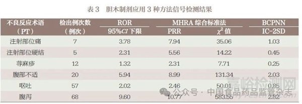 收集國家藥品不良反應(yīng)監(jiān)測中心與海南省藥物警戒中心在2004 年1 月1 日至2023 年6月30 日的不良反應(yīng)報告,以通用名“膽木浸膏糖漿”“膽木注射液”“膽木浸膏片”“膽木浸膏膠囊”以及商品名“森震”“木嚴(yán)青”“森博”“珍木青”為目標(biāo)藥物名稱進(jìn)行檢索,進(jìn)行數(shù)據(jù)清洗、去重處理后,共得到膽木制劑相關(guān)的不良反應(yīng)報告353 例,其中膽木制劑作為懷疑用藥的報告共343 例,據(jù)此構(gòu)建綜合性上市后監(jiān)測數(shù)據(jù)庫。使用3 種方法共同檢出的信號有6 個,分別是注射部位痛、注射部位硬結(jié)、蕁麻疹、腹部不適、嘔吐、腹瀉,信號檢測結(jié)果見表3。