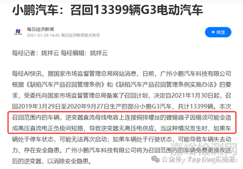 2021年,因鍍錫端子錫須可能會(huì)造成高壓直流電正負(fù)極間短路,小鵬召回13399輛G3電動(dòng)汽車。