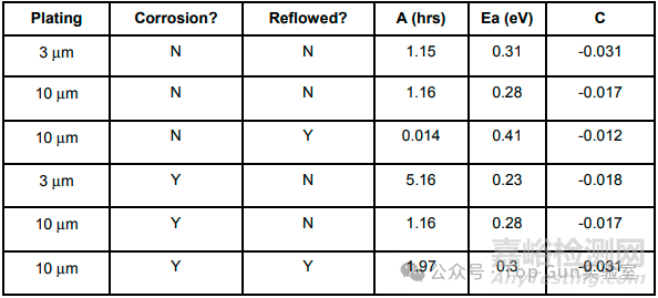 結(jié)論:由于溫度和濕度的差異,從加速環(huán)境轉(zhuǎn)移到正常使用環(huán)境,錫須成核時(shí)間(TTWN)值將增加到加速應(yīng)力值的 7.23 倍。