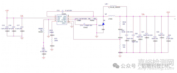 從圖上不難看出這是一路降壓電路,輸入輸出端雖有多個電容做濾波但是容值都是同樣的,同容值的電容濾波頻段固定,不能形成寬頻濾波,我們可以考慮調(diào)整電容容值,加大濾波頻段;同時考慮在SW腳加RC電路濾波。