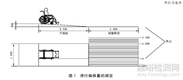 手動輪椅車按照標(biāo)明的最大使用者質(zhì)量配重后,然后推至下坡面的起始位置,使其右邊的驅(qū)動輪與零線重合,小腳輪調(diào)至向前滾動的方向,制動器放松。使手動輪椅車沿下坡面下滑。觀察并記錄檢驗(yàn)軌道的終點(diǎn)處手動輪椅車右輪偏移零線的距離。