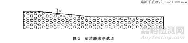 將手動三輪輪椅車放置在坡度為6°的水泥路面測試道上(見圖2),操作人員坐在輪椅車上,并放上配重,以椅座前沿距坡底2m處為起點(diǎn),依靠勢能向下滾動,當(dāng)后輪到達(dá)坡底時立即剎車,待輪椅車停止后測量后輪走過的距離。