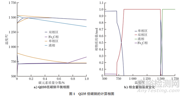 試驗(yàn)材料為Q235低碳鋼,Q235低碳鋼的計(jì)算相圖如圖1所示。由圖1可知:Q235低碳鋼的奧氏體轉(zhuǎn)變溫度為840℃;隨著溫度降低,奧氏體析出先共析鐵素體,其相組成為奧氏體和鐵素體;隨著溫度的繼續(xù)降低,奧氏體發(fā)生共析反應(yīng),生成珠光體,其相組成為鐵素體和滲碳體(Fe3C)。