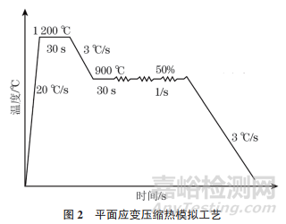 采用Thermecmastor型熱模擬試驗(yàn)機(jī)進(jìn)行壓縮試驗(yàn),試樣的尺寸(長(zhǎng)度× 寬度× 高度,下同)為30mm× 30mm×140mm。根據(jù)圖1的計(jì)算相圖,制定了Q235低碳鋼的熱模擬工藝(見(jiàn)圖2)。首先將試樣以20℃/s的升溫速率升溫至1200℃,并保溫30s,使得低碳鋼完全奧氏體化,再以3℃/s 的降溫速率降到900℃,并保溫30s;然后以應(yīng)變速率為1s-1進(jìn)行總形變量50%的3道次壓縮,每道次下壓5mm;最后以3℃/s的降溫速率將奧氏體鋼冷卻到室溫。