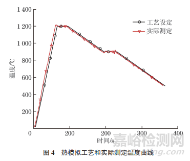 為確定大試樣的均溫區(qū),設(shè)定的熱模擬工藝如圖3所示,同時(shí)對(duì)距離中心線左端10mm和20mm的溫度進(jìn)行了測(cè)量。由圖3可知:大試樣在升溫階段,以及1200,1000,800℃保溫階段的溫度相對(duì)穩(wěn)定,中心線與左端10mm處的溫差約為20℃,結(jié)合大試樣溫度分布的對(duì)稱性,大試樣均溫區(qū)尺寸為30mm×30mm×20mm,平面應(yīng)變壓頭半徑為10mm,滿足大試樣均溫性的要求。