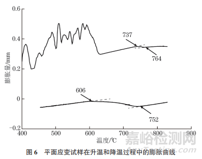 圖6為平面應(yīng)變?cè)嚇釉谏郎睾徒禍剡^(guò)程中的膨脹曲線。由圖6可知:Q235低碳鋼的奧氏體相變溫度為737℃,完全奧氏體化的溫度為764℃;Q235低碳鋼中奧氏體生成鐵素體的相變溫度為752℃,相變完成的溫度為606℃。