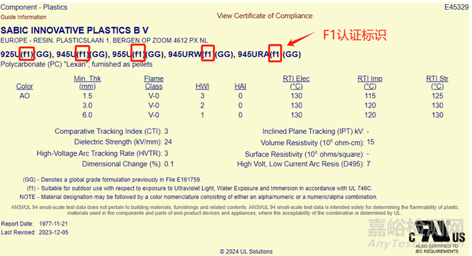 在UL的抗紫外線(UV)測試標(biāo)準(zhǔn)中,"F1"和"F2"是用來標(biāo)注塑料或其他材料戶外耐候性等級的符號,這些等級記錄在UL黃卡上。它們代表了材料對于紫外線暴露、耐水性以及浸漬試驗的不同耐受程度,具體區(qū)別如下: