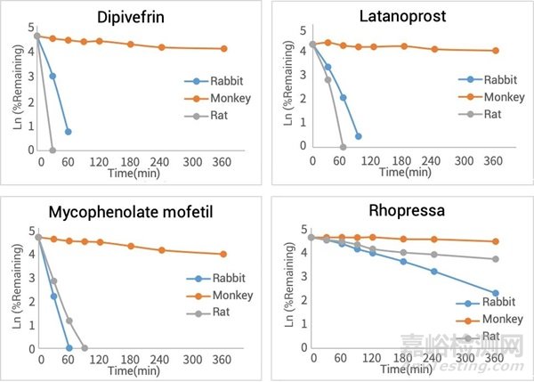 圖4. 測(cè)試化合物在不同種屬角膜組織勻漿中的代謝穩(wěn)定性