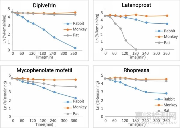 將測(cè)試化合物Dipivefrin、Latanoprost、Mycophenolate mofetil、Rhopressa分別在兔子、猴、大鼠的角膜組織勻漿中,經(jīng)37℃水浴孵育6小時(shí)后,所得實(shí)驗(yàn)結(jié)果如圖4所示。所有測(cè)試化合物均有明顯代謝趨勢(shì);其中Dipivefrin、Latanoprost、Mycophenolate mofetil在兔子和大鼠的角膜組織勻漿中的代謝速度明顯快于猴的角膜組織勻漿;Rhopressa在兔子的角膜組織勻漿中的代謝速度稍快于猴和大鼠的角膜組織勻漿。