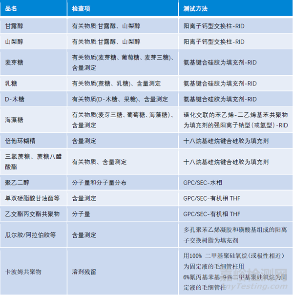 表 1.色譜方法相關(guān)的典型輔料及對(duì)應(yīng)檢測(cè)項(xiàng)