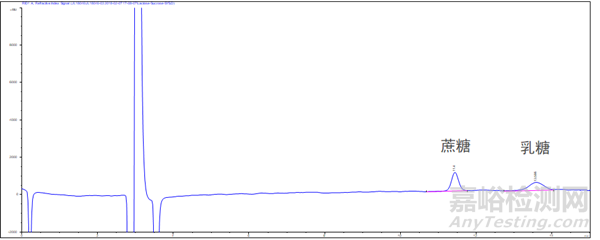 圖 1. 乳糖分析系統(tǒng)適用性溶液圖譜(色譜柱:Zorbax NH2,4.6*250mm,5μm,部件號(hào)880952-708;流動(dòng)相:乙腈-水(70:30);儀器系統(tǒng):1260 LC-RID)