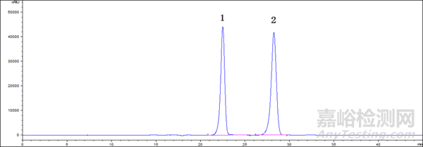 圖 2. 甘露醇分析系統(tǒng)適用性溶液圖譜:1-甘露醇,2-山梨醇(色譜柱:Hi-Plex Ca,7.7*300mm,8μm,部件號(hào)PL1170-6810;流動(dòng)相:水;柱溫:80℃;儀器系統(tǒng):1260 LC-RID)