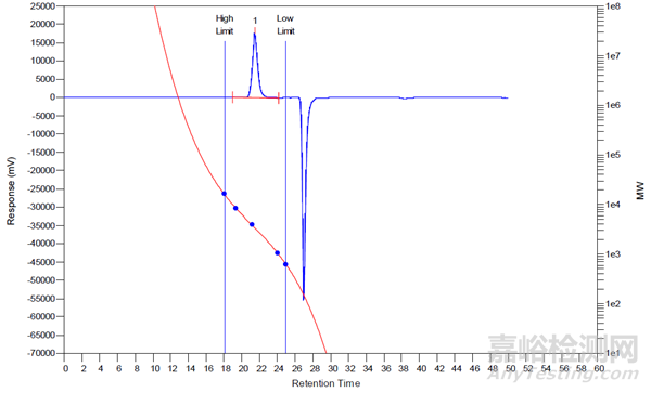 圖 4. 聚乙二醇4000分子量和分布測(cè)定(色譜柱:PL aquagel OH 20/30,7.5 x 300 mm,5 μm, 雙柱串聯(lián),部件號(hào) PL1120-6520 & PL1120-6830;流動(dòng)相:100mM NaNHO3 ;儀器系統(tǒng):1260 GPC-RID)