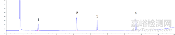 圖 6. PEG4000 中高沸點(diǎn)成分的檢查對(duì)照溶液(1-4號(hào)峰分別為乙二醇、1,3-丁二醇(內(nèi)標(biāo))、二甘醇、三甘醇)(色譜柱:Agilent J&W VF-17ms, 30m 0.53mm ,1.0m,部件號(hào):CP9001)