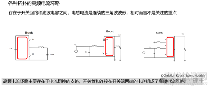 理由:Buck電路輸入端的高頻電流在輸入電容和功率開關之間流動,回路面積越大,輻射EMI和寄生電感越高。